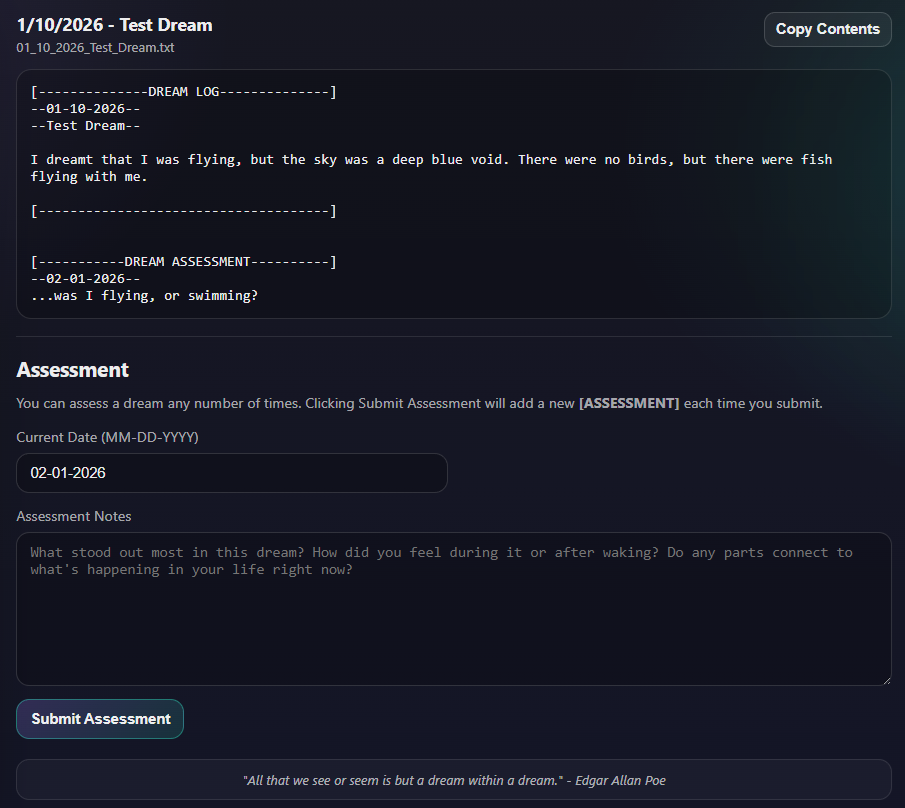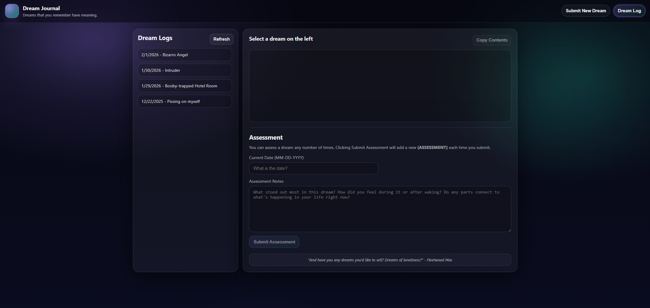 A browser based dream journal app that lets users name a dream, enter the date, describe it, save entries as local text files, review past dreams through the web UI, and add later reflections for deeper analysis.