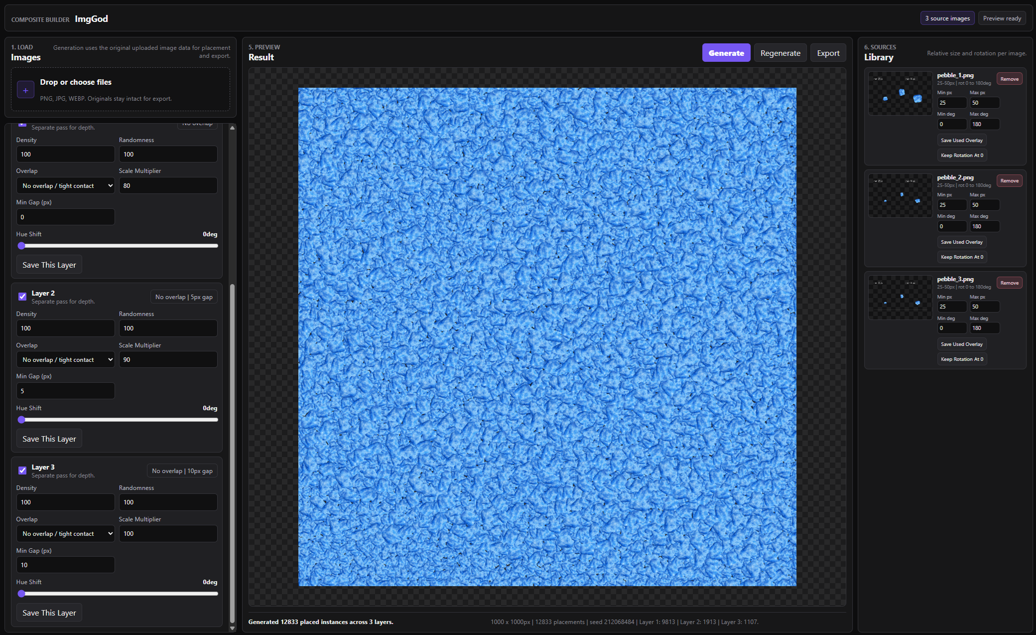 I needed something very specific: convincing, densely packed gravel that I could customize with three different colors. The usual options kept failing me because rendering thousands of individual gravel images caused browser stuttering, making a static image by hand was tedious and still did not look random enough, and creating lower-resolution gravel layers that could be recolored in code by shifting hue was difficult with the tools I had. So I decided to build a tool to solve that exact problem.