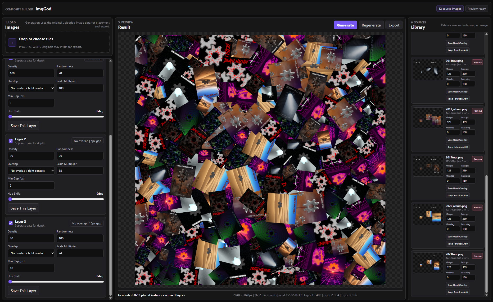 An image composite generator that takes input images and user set rules and outputs a randomized composite image.